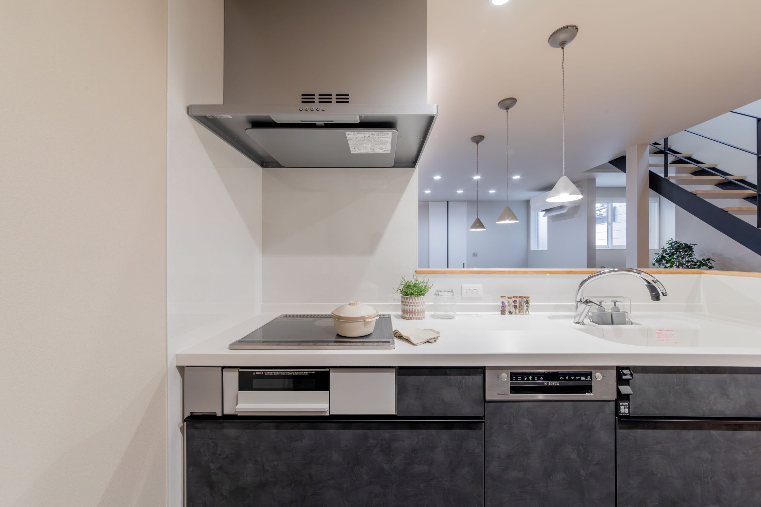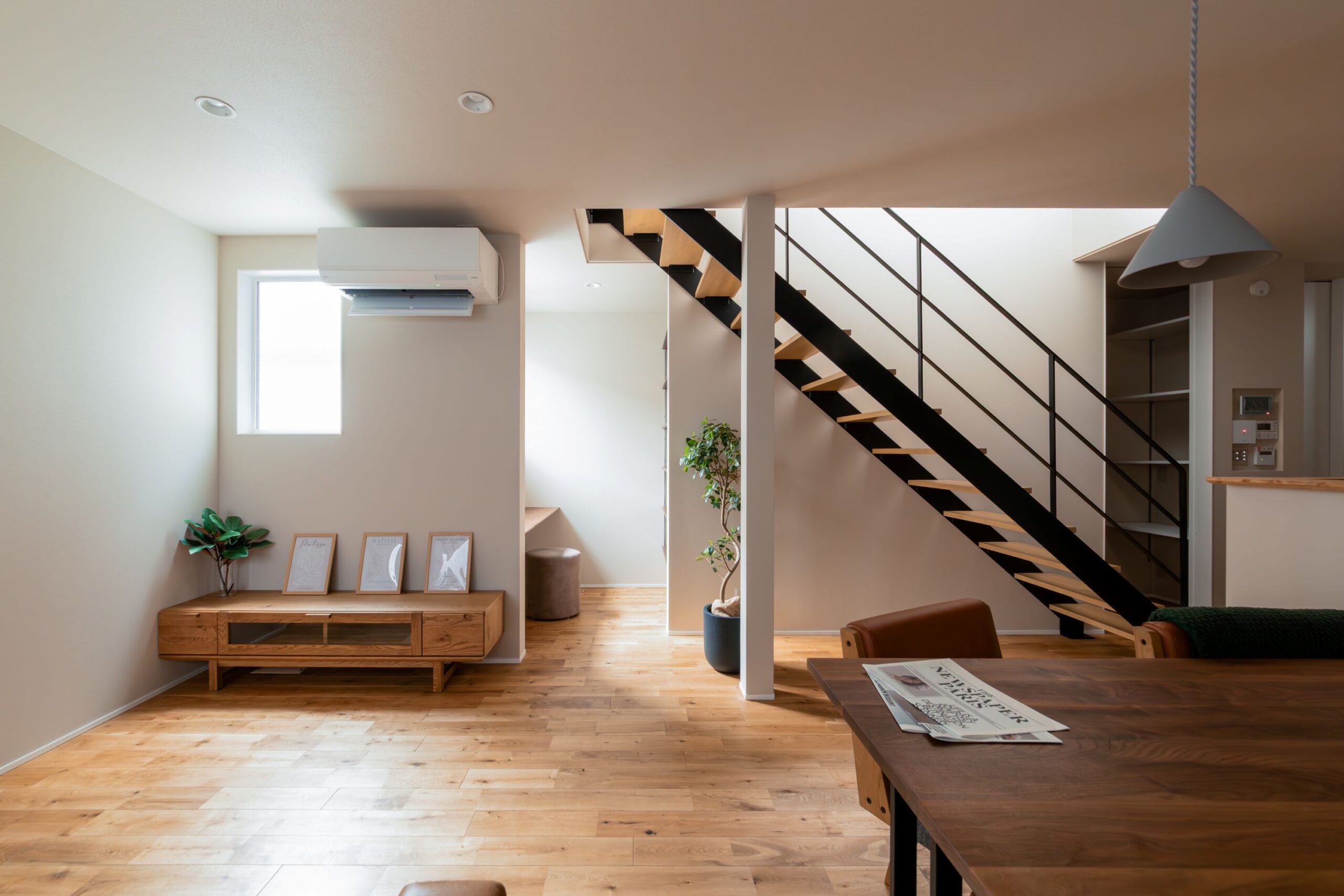 アイアン階段の吹き抜けと計画された窓から降り注ぐ光が、住まい全体を明るく照らし、家族が自然と集まる心地よいLDKを実現。