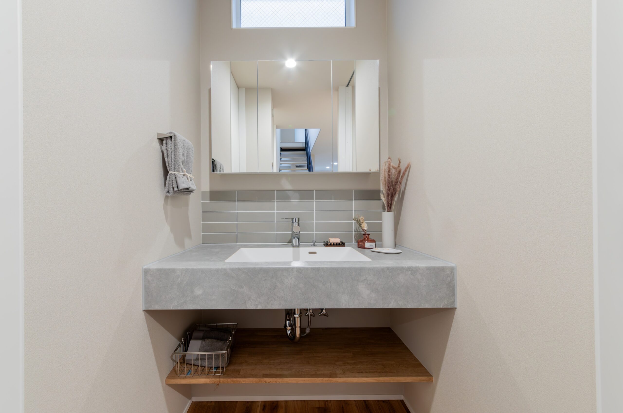 シンプルでありながら、素材の質感が際立つ造作洗面台。使い勝手と美しさを兼ね備え、空間に調和するデザインに仕上げました。
