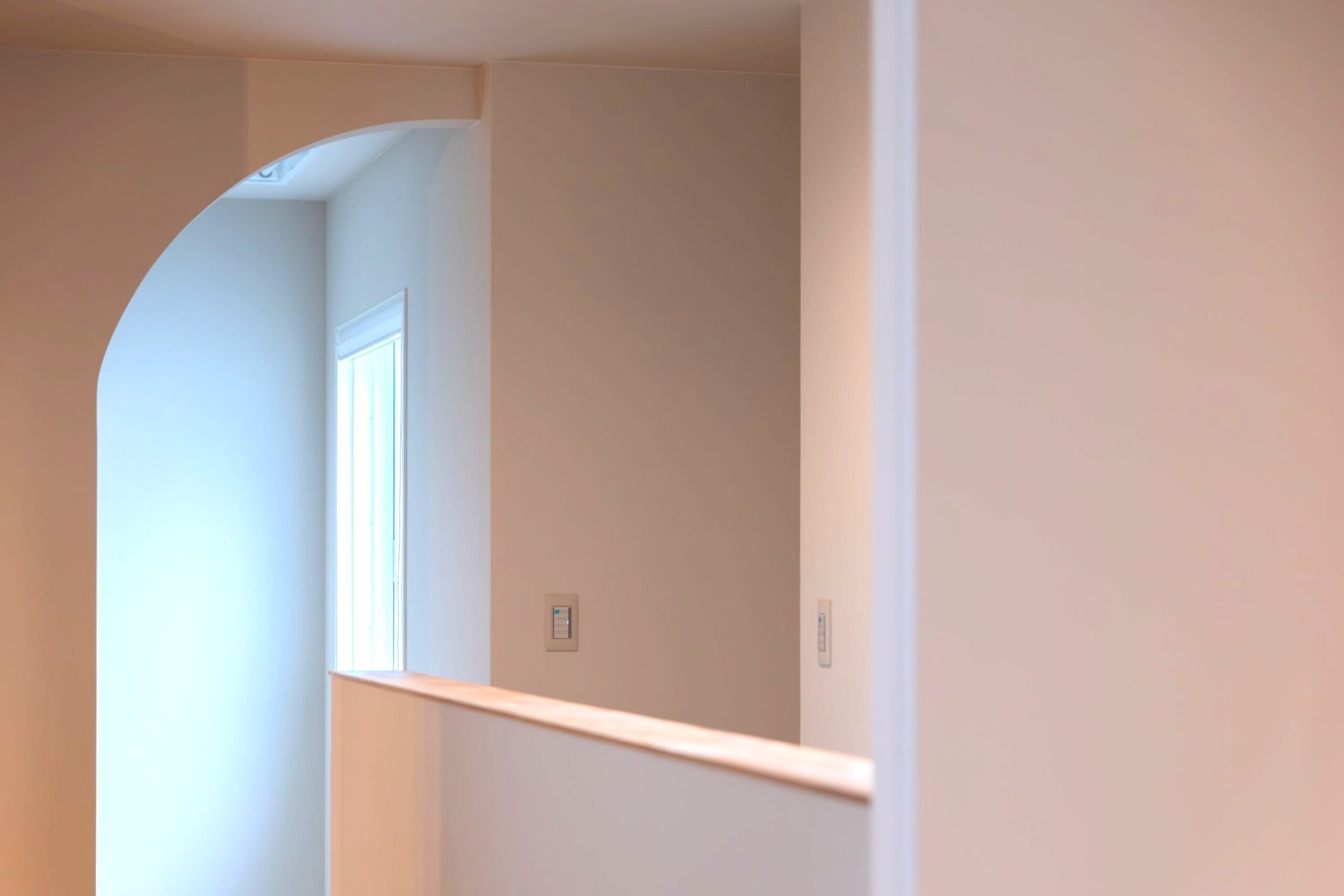 やわらかな曲線が空間に優雅な印象を与える半円のアーチ壁。デザイン性と開放感を両立し、2階の窓から1階に光を届けます。