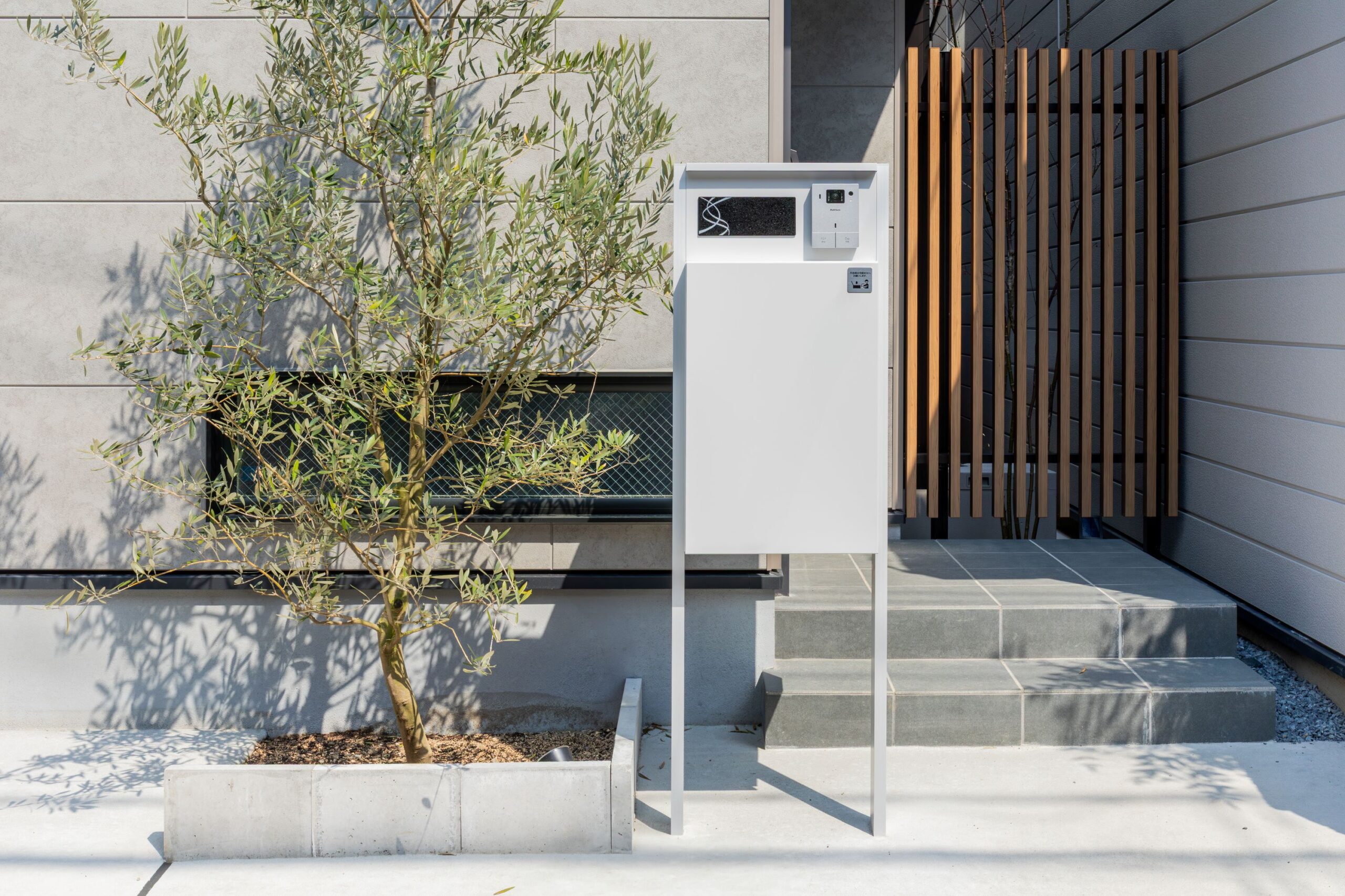 シンプルで洗練された外観に合わせたポスト。機能性とデザイン性を兼ね備え、住まいの顔として美しい佇まいを見せる。