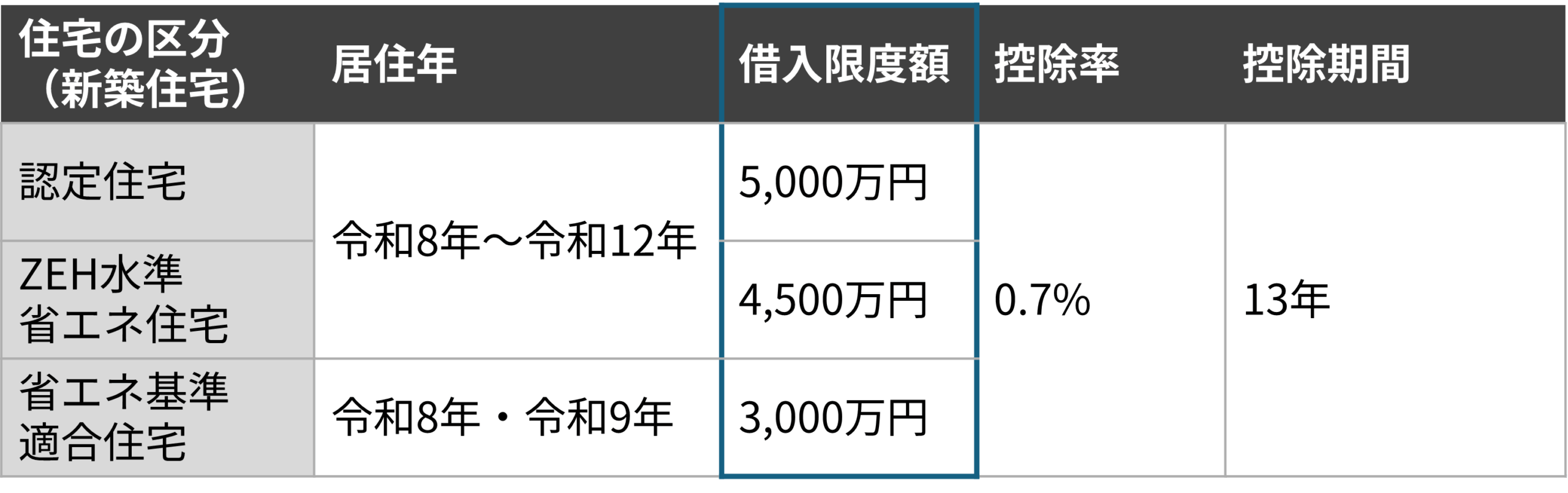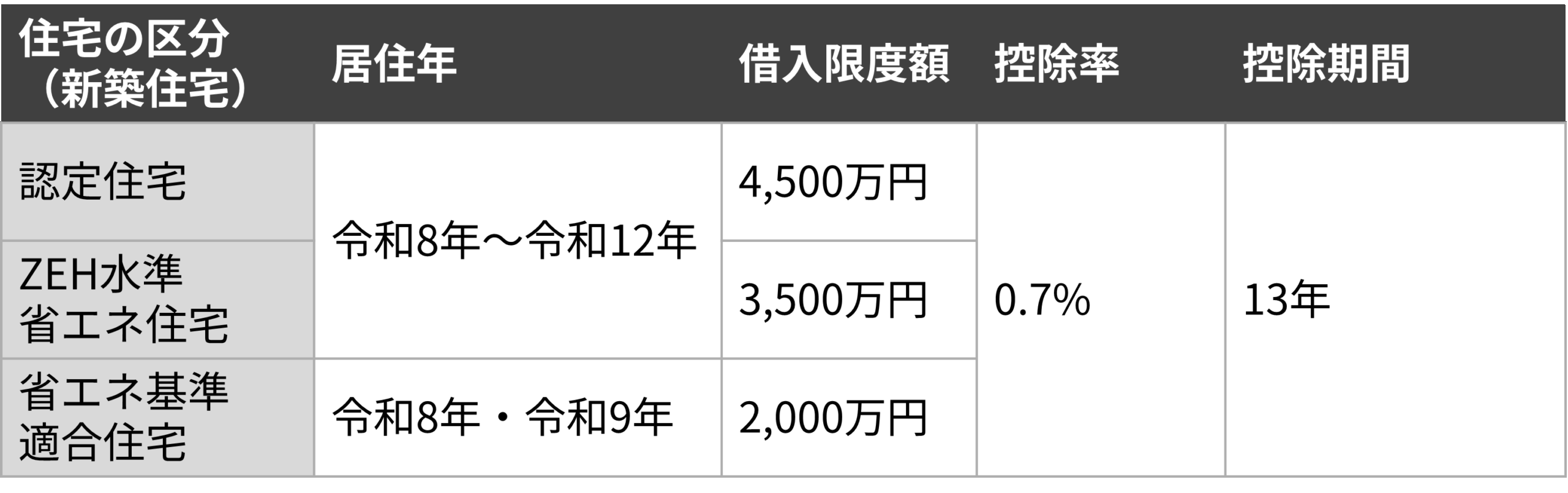 控除率0.7%の枠組みも維持され、住宅の性能区分ごとに借入限度額と控除期間が整理されています。