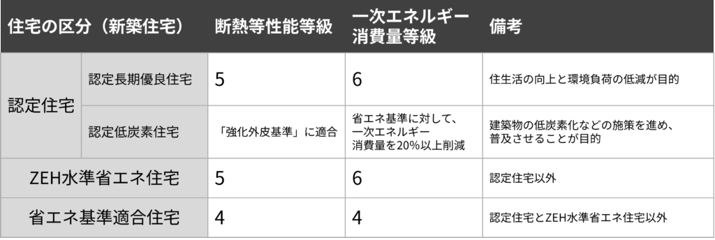 ZEH水準省エネ住宅…「省エネ性能が高いことを“等級”で証明する区分」で、税制上は断熱等性能等級5以上かつ一次エネルギー消費量等級6以上が要件として整理されています。